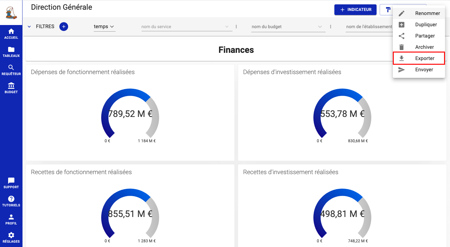 Sur Manty, vous pouvez exporter vos tableaux de bord en format pdf ainsi que les envoyer par email directement via la plateforme.