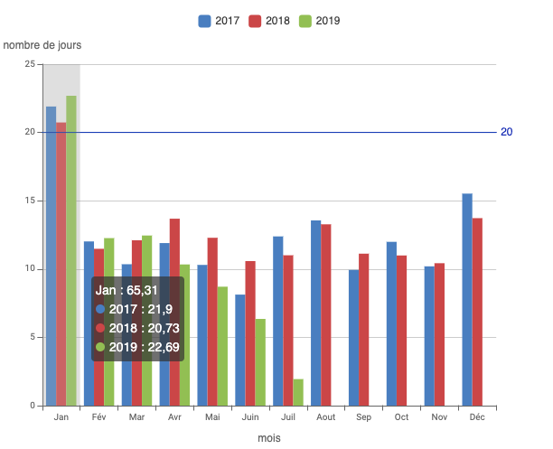 Par exemple, ce graphique permet de visualiser à la fois l'évolution du délai moyen de mandatement au fil des mois, et entre les années.