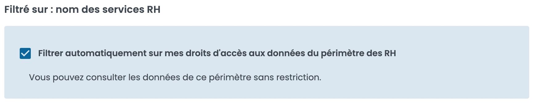 Par exemple, si vous ajoutez un filtre sur le nom des services RH ou des services Finances, spécifiez les droits à appliquer sur ce périmètre en sélectionnant "Filtrer automatiquement sur mes droits d'accès aux données du périmètre des finances/ ressources humaines".