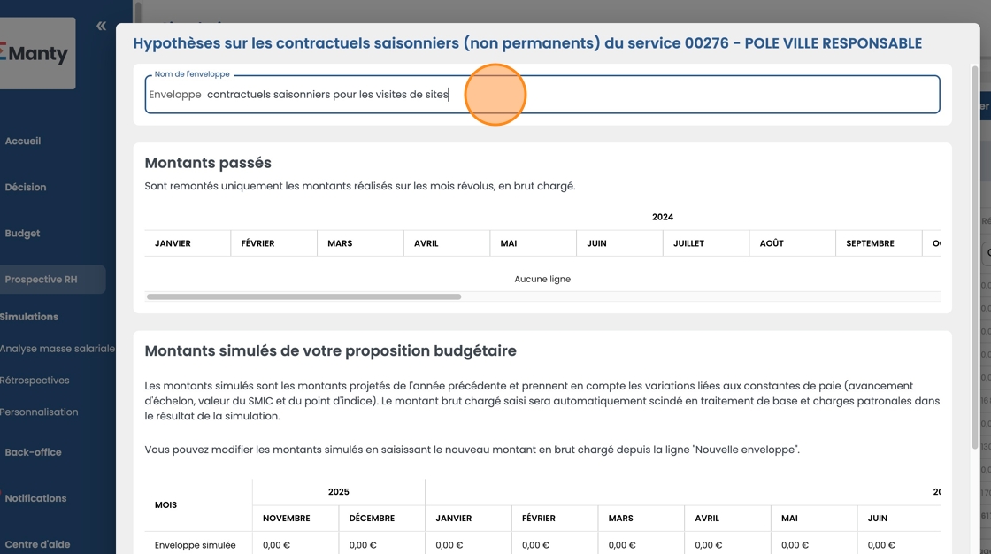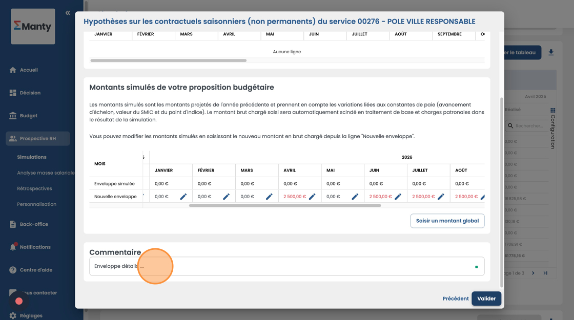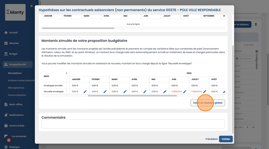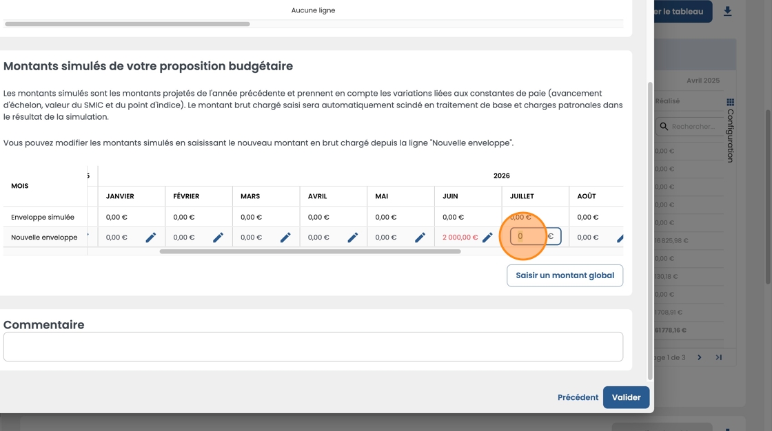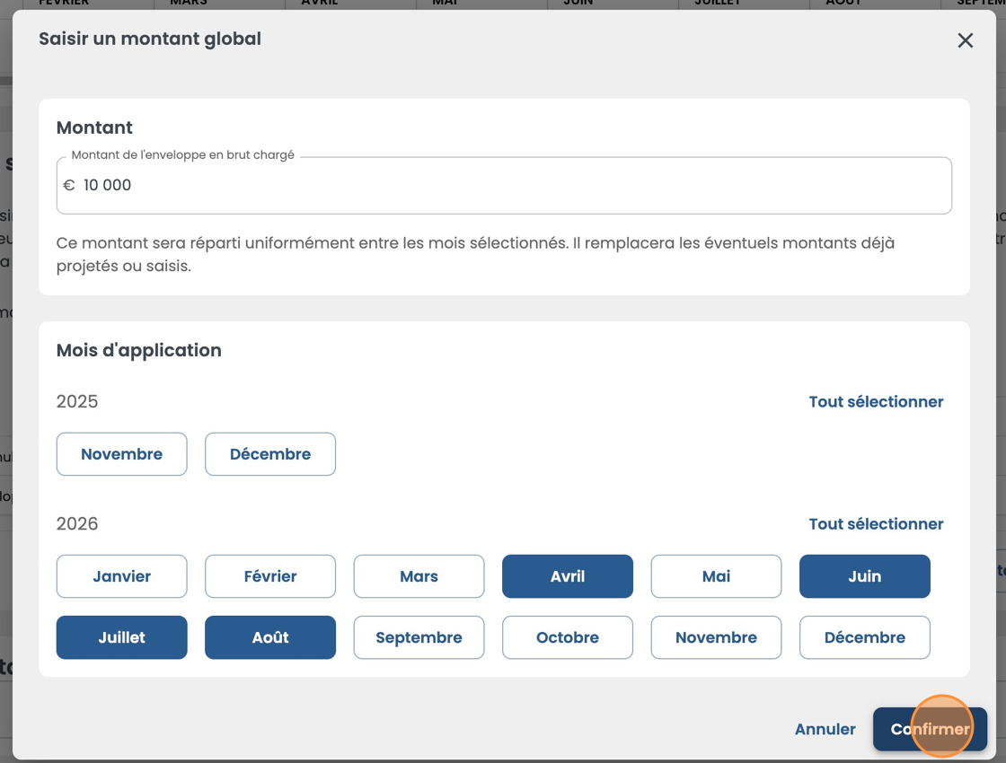 - Saisissez le montant global de l'enveloppe puis sélectionnez les mois sur lesquels répartir le montant et confirmez.