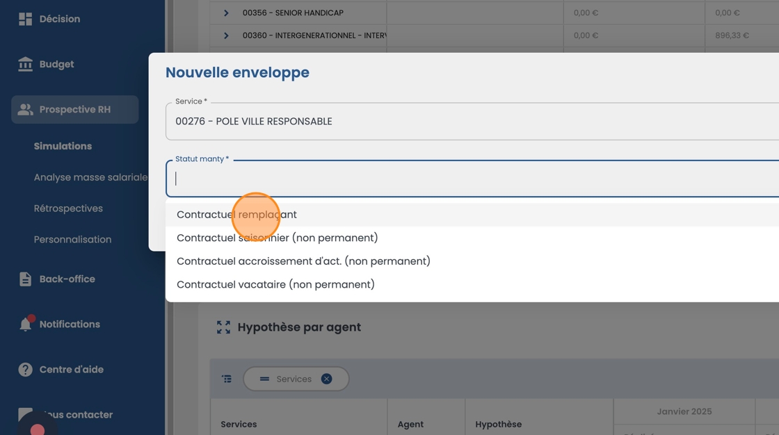 2\. Choisissez le service et le statut Manty des agents concernés par l'enveloppe.