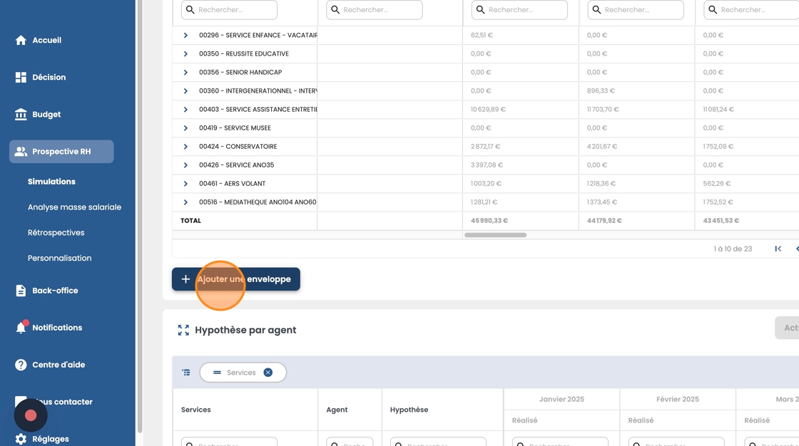 - Les agents de ces statuts sont ensuite répartis dans les 2 tableaux de dessous depuis lesquels vous allez pouvoir ajouter des agents, des enveloppes et des hypothèses